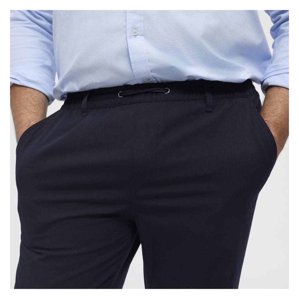 As calças têm bolsos de lado e atrás