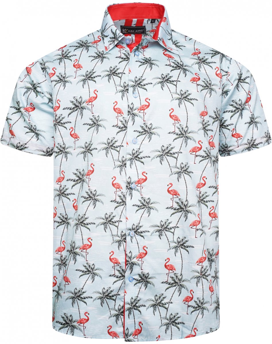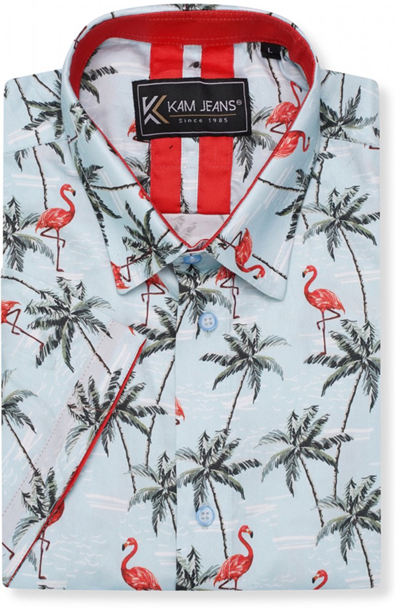 Guia de tamanhos - Kam Jeans 6067 Flamingo and Palm Tree Short Sleeve Shirt Blue