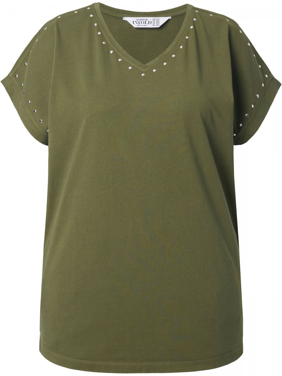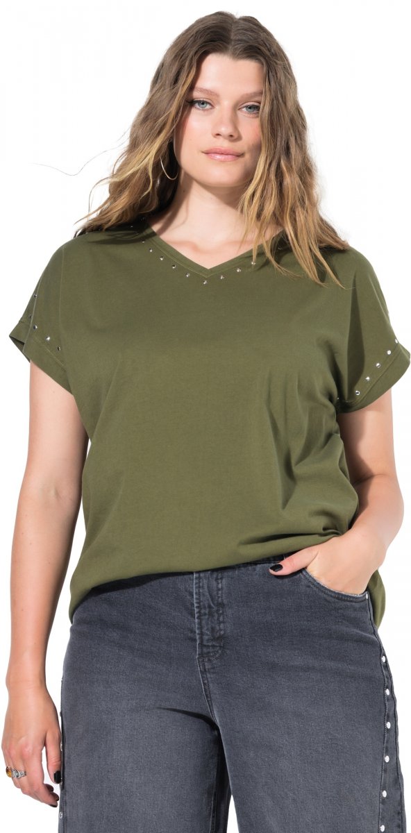 Ulla Popken Oversized studded Acid-washed V-Neck T-shirt Palm Green