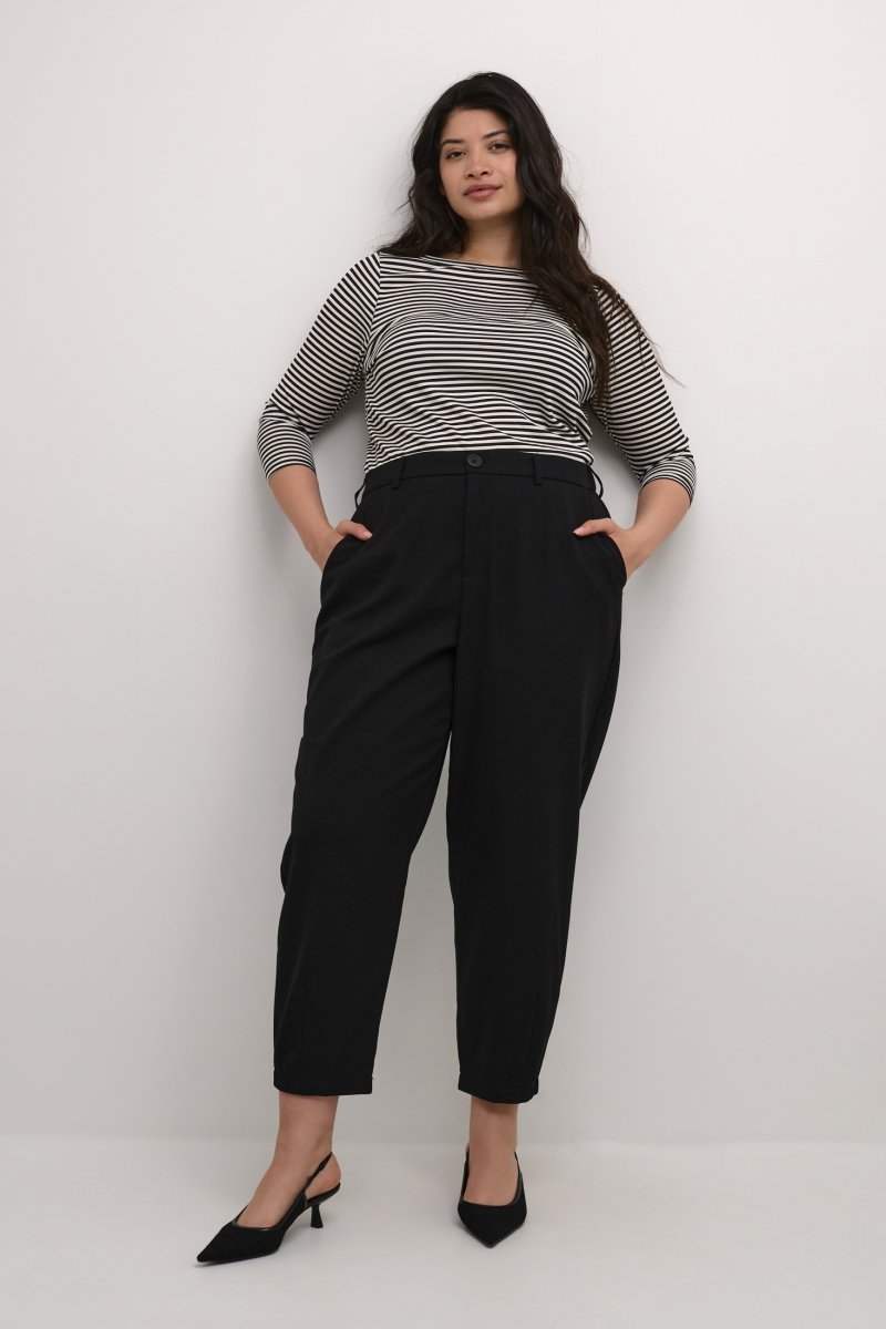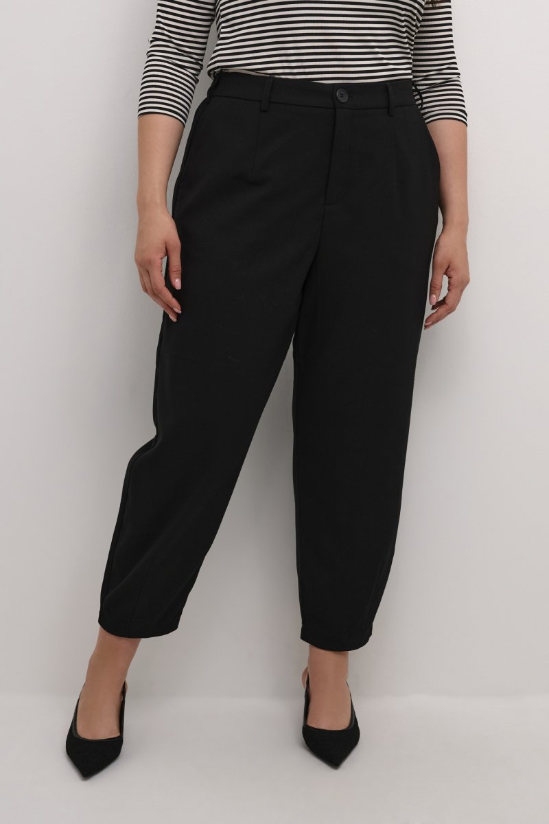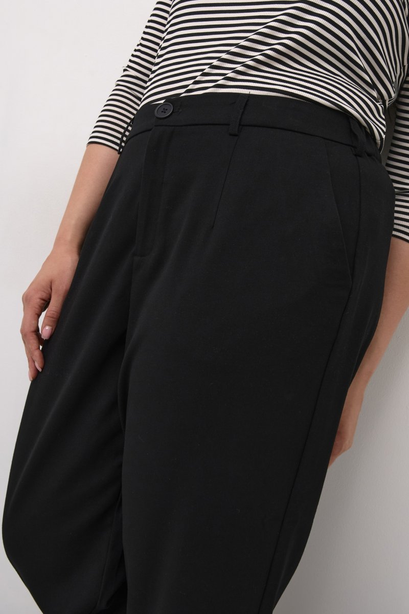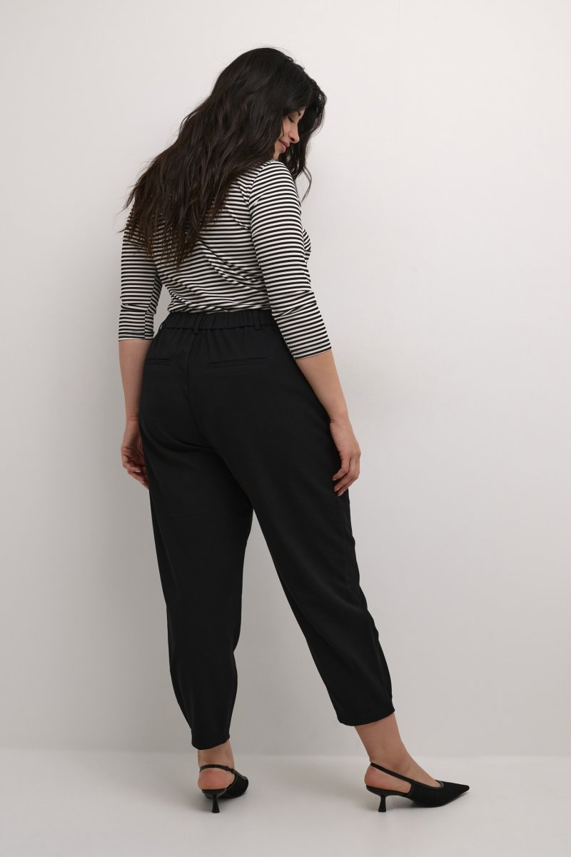 CalçasDisponível nos tamanhos 42–56Da marca Kaffe CurveFeito de 64% poliéster (reciclado), 33% viscose, 3% elastanoCorte largoCor pretoClique aqui para ver o guia de tamanhos