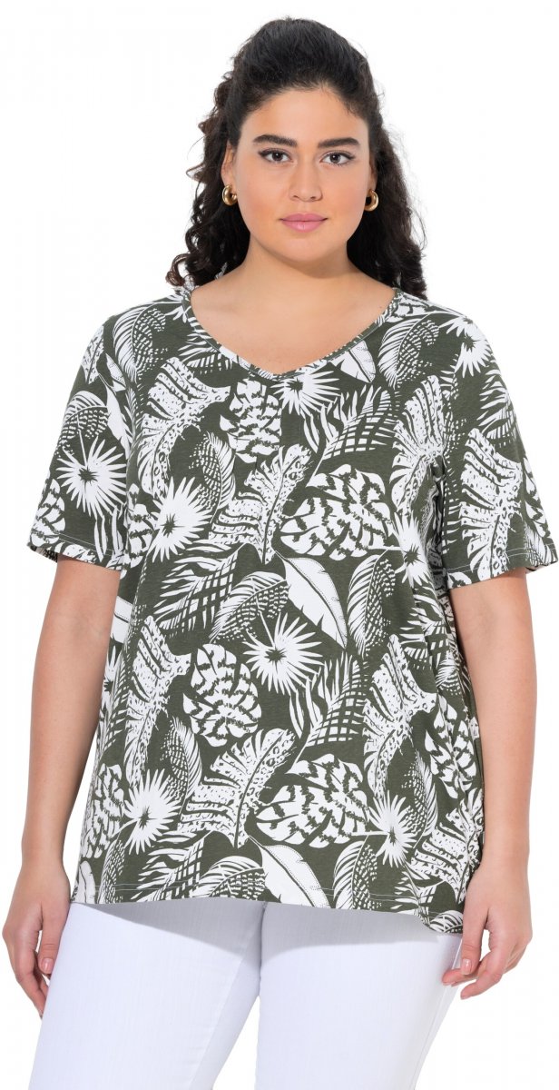 Guia de tamanhos - Ulla Popken Feather Print Short Sleeve V-Neck Tee Olive Grey