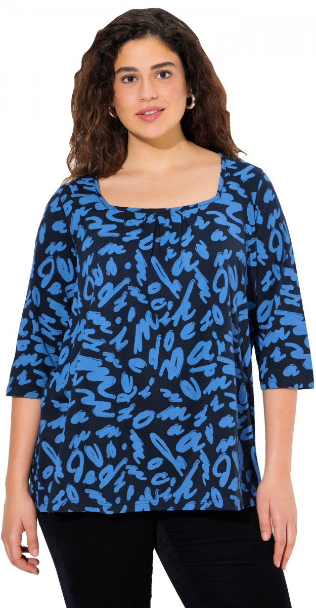 Ulla Popken Scribble Print Square Neck 3/4 Sleeve Tee Navy